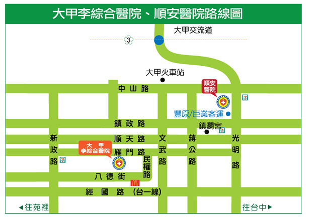 搭乘豐原客運(豐原-后里-大甲)至順安醫院等候→轉搭本院交通車至院區 |