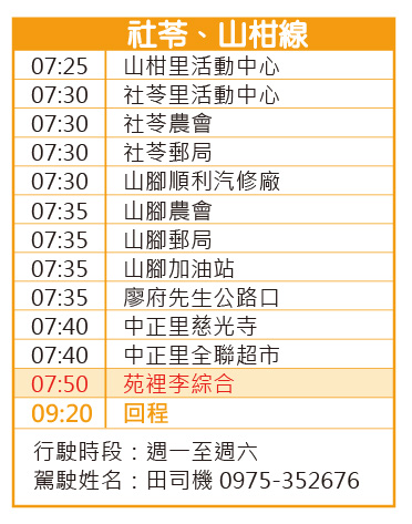 交通指南>醫療專車>苑裡線>社苓、山柑線