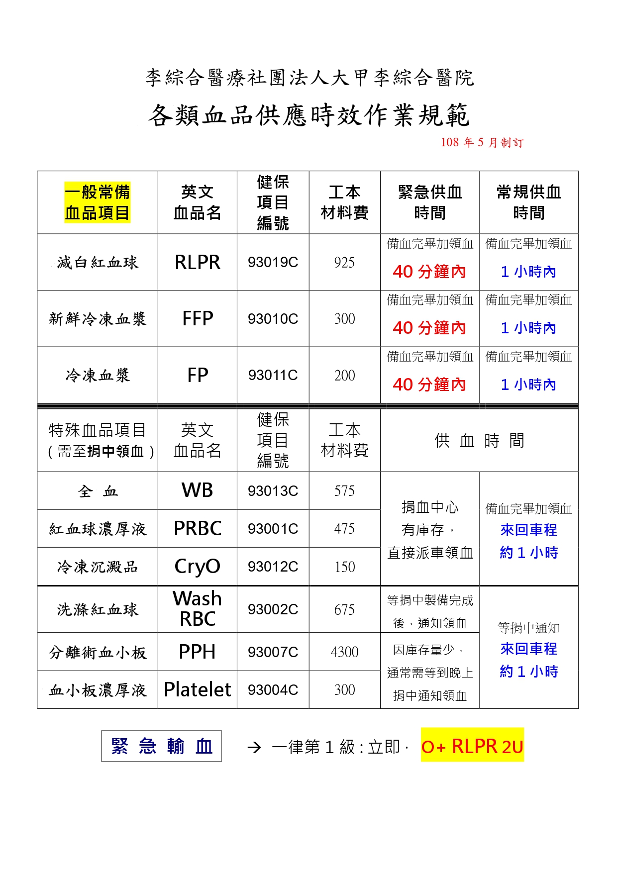 衛教天地>>檢驗資訊>各類血品供應時效作業