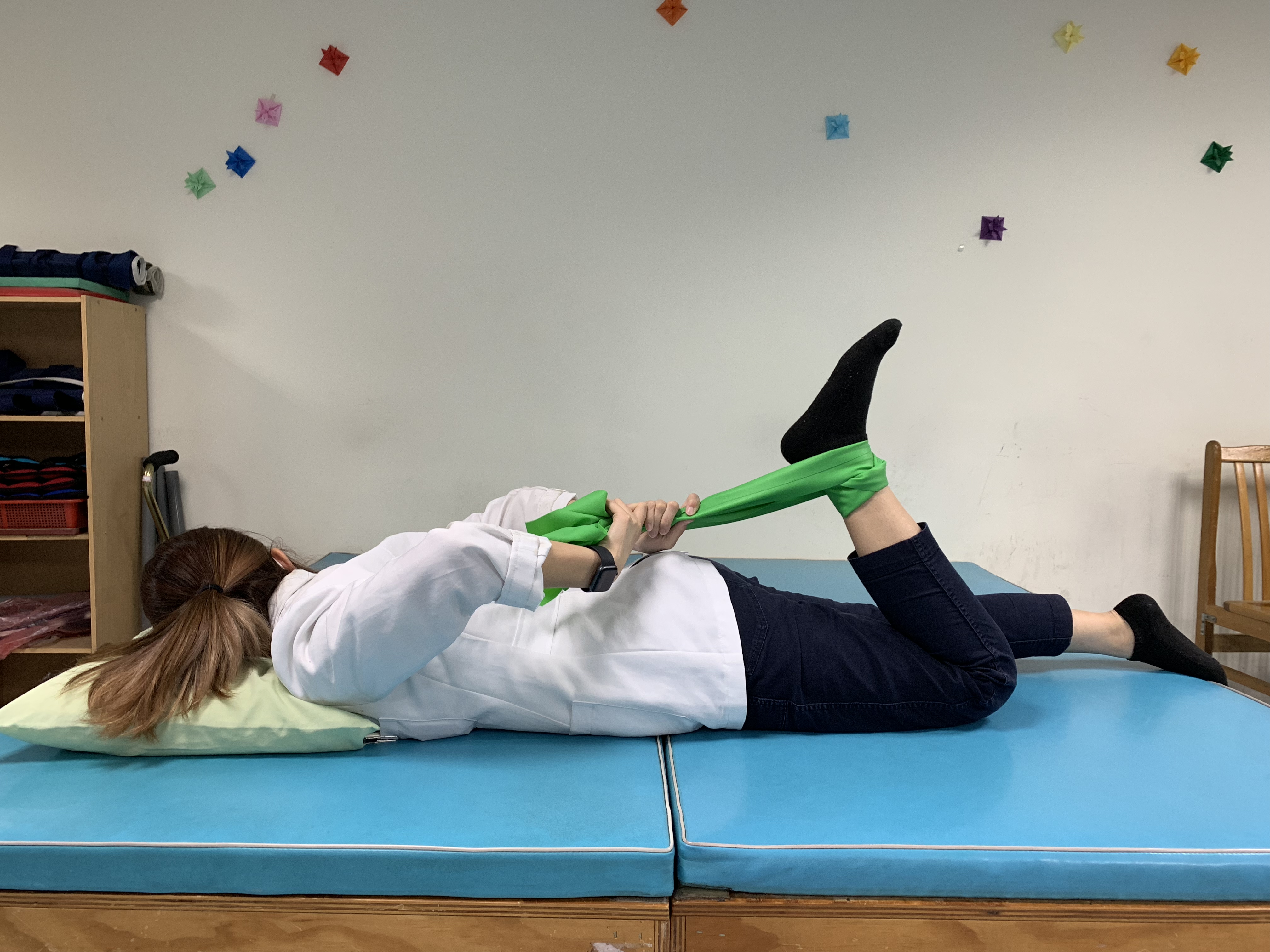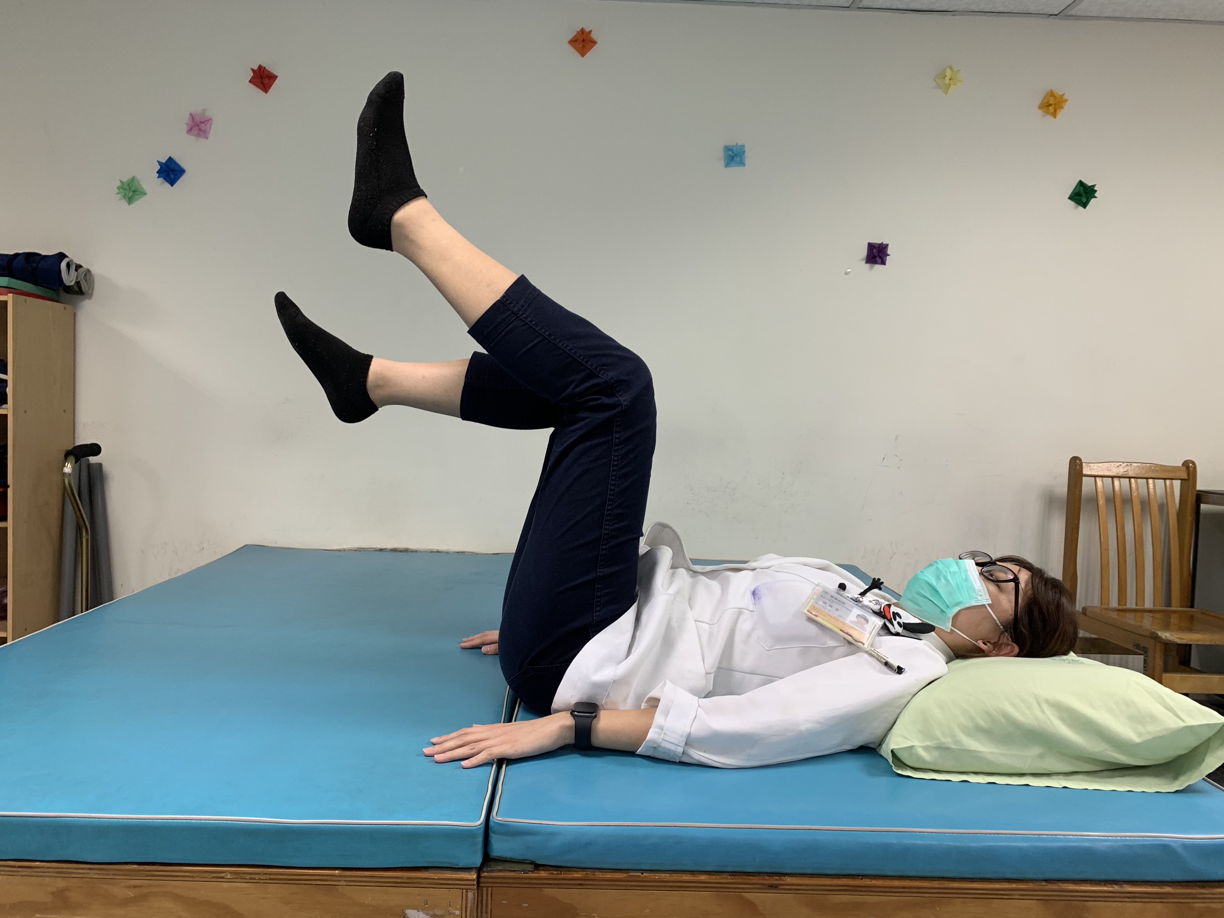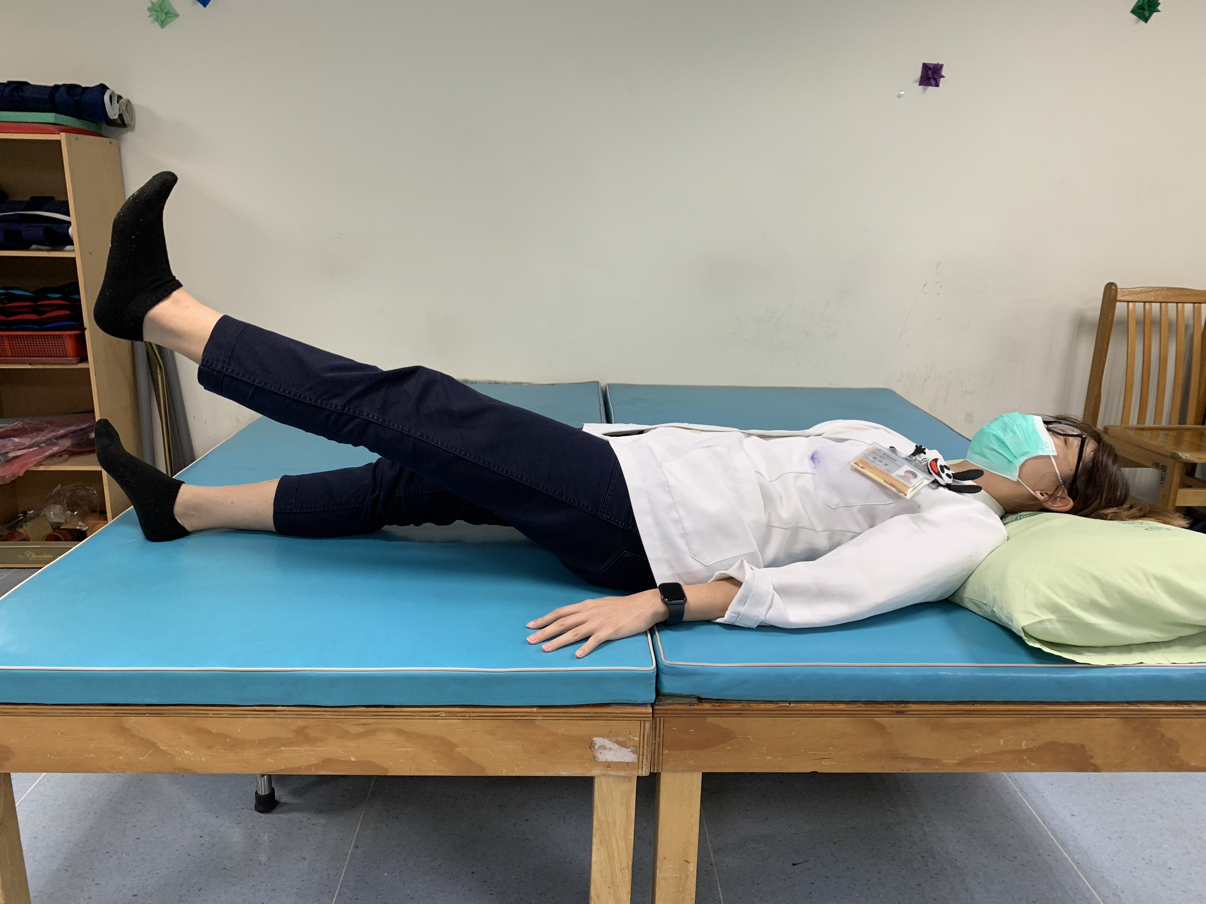 仰臥,兩腿伸直,兩手捉緊床緣,慢慢腿舉起,盡量舉高,再慢慢放下,膝部不能彎曲,重覆十次,每次做三次運動。