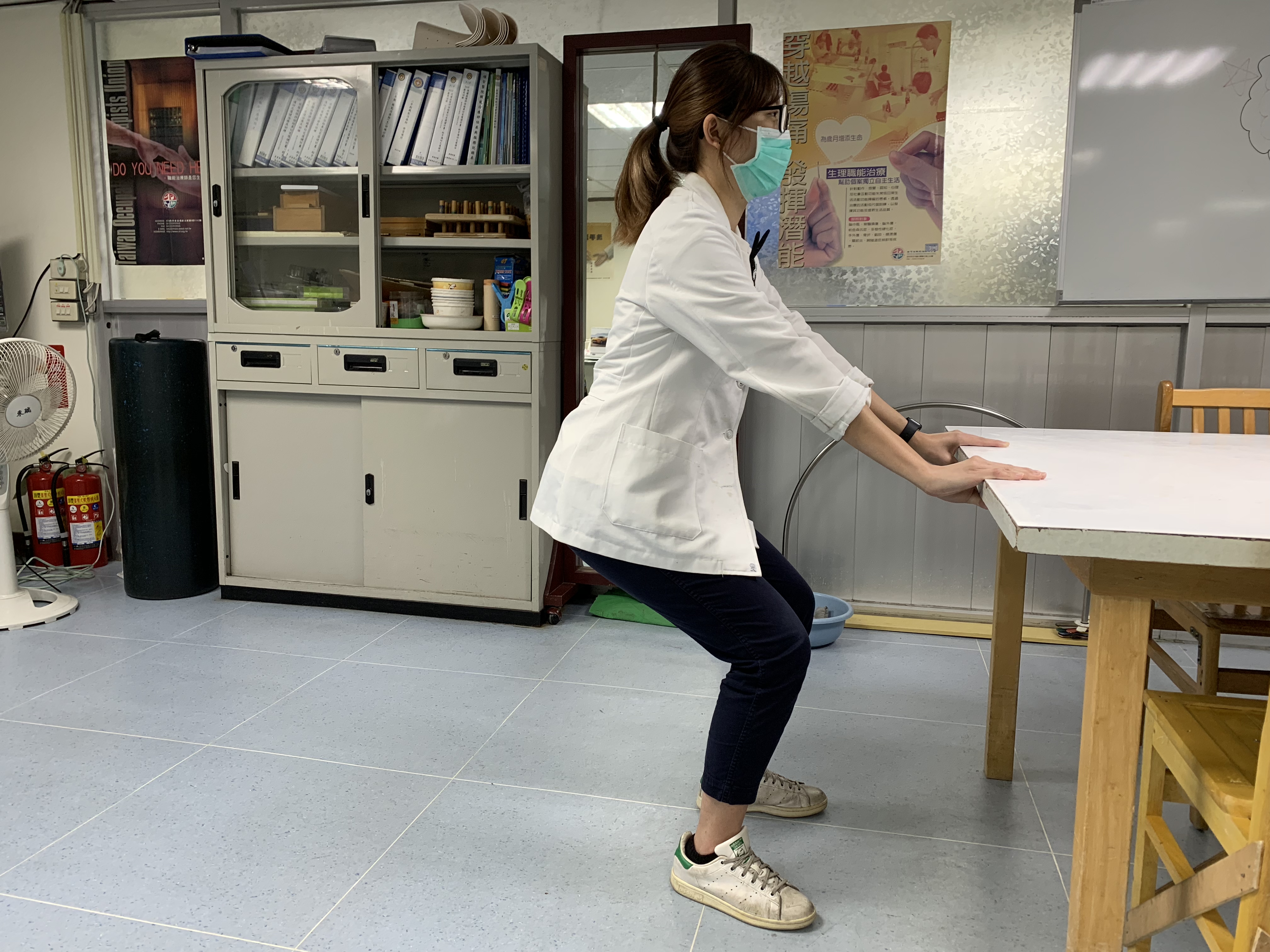 (2)兩腿站立。兩手扶住桌子,用力彎屈雙腿。