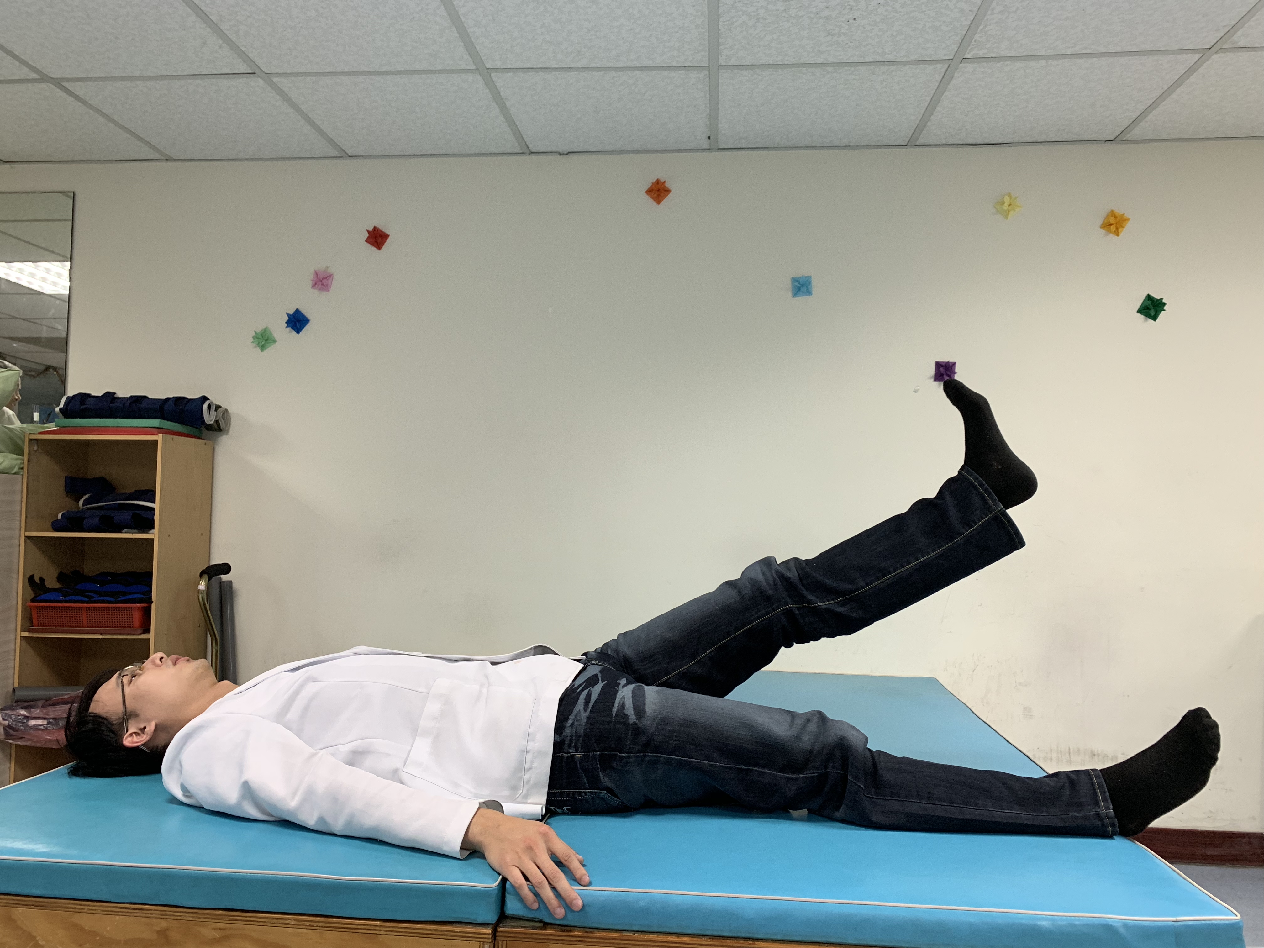 1仰臥姿單腳抬高約45-60度維持3秒~5秒的時間,再緩緩放下注意膝要保持挺直。