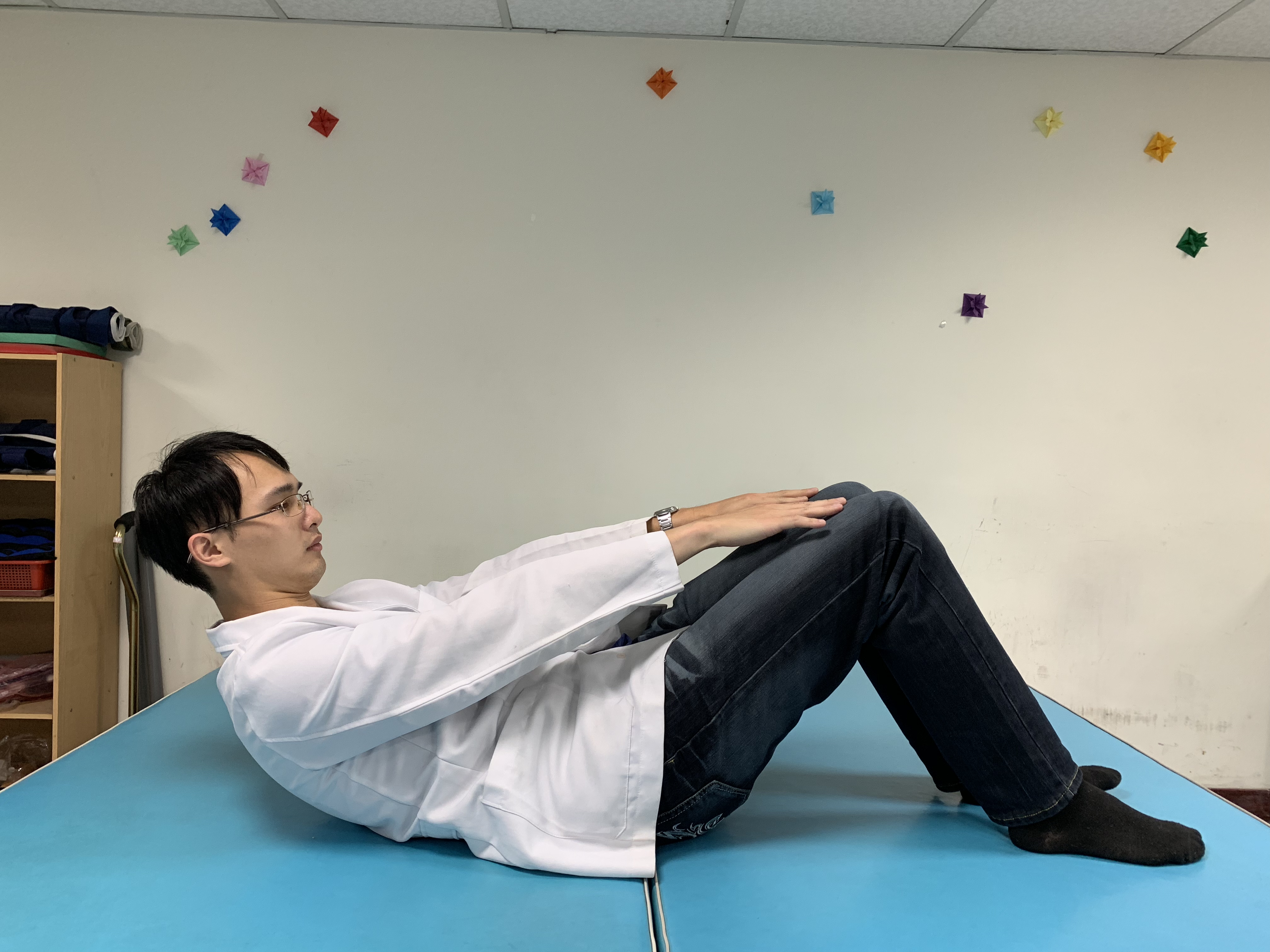 1仰臥姿雙手抱膝部,使儘量貼近腹部。