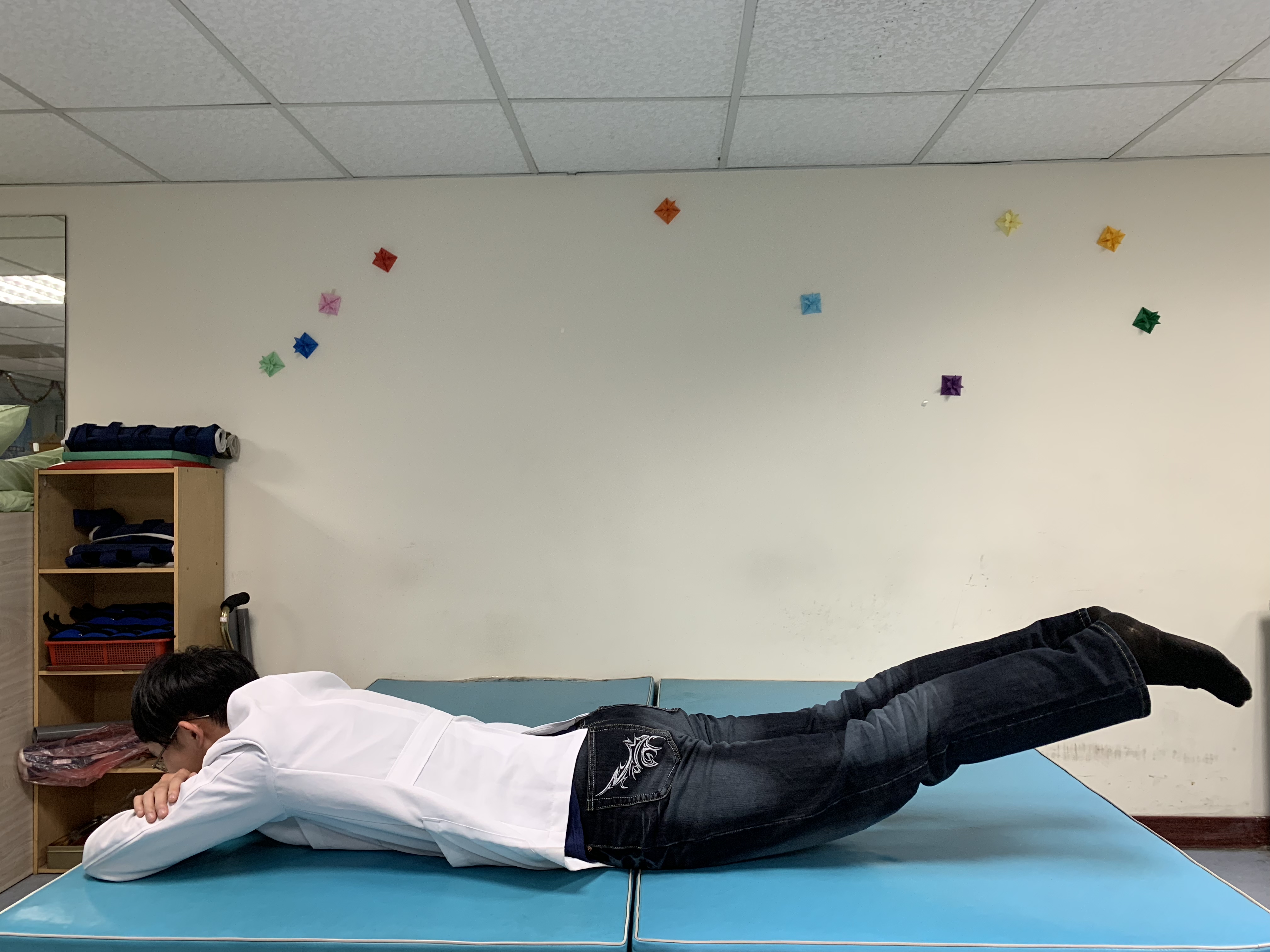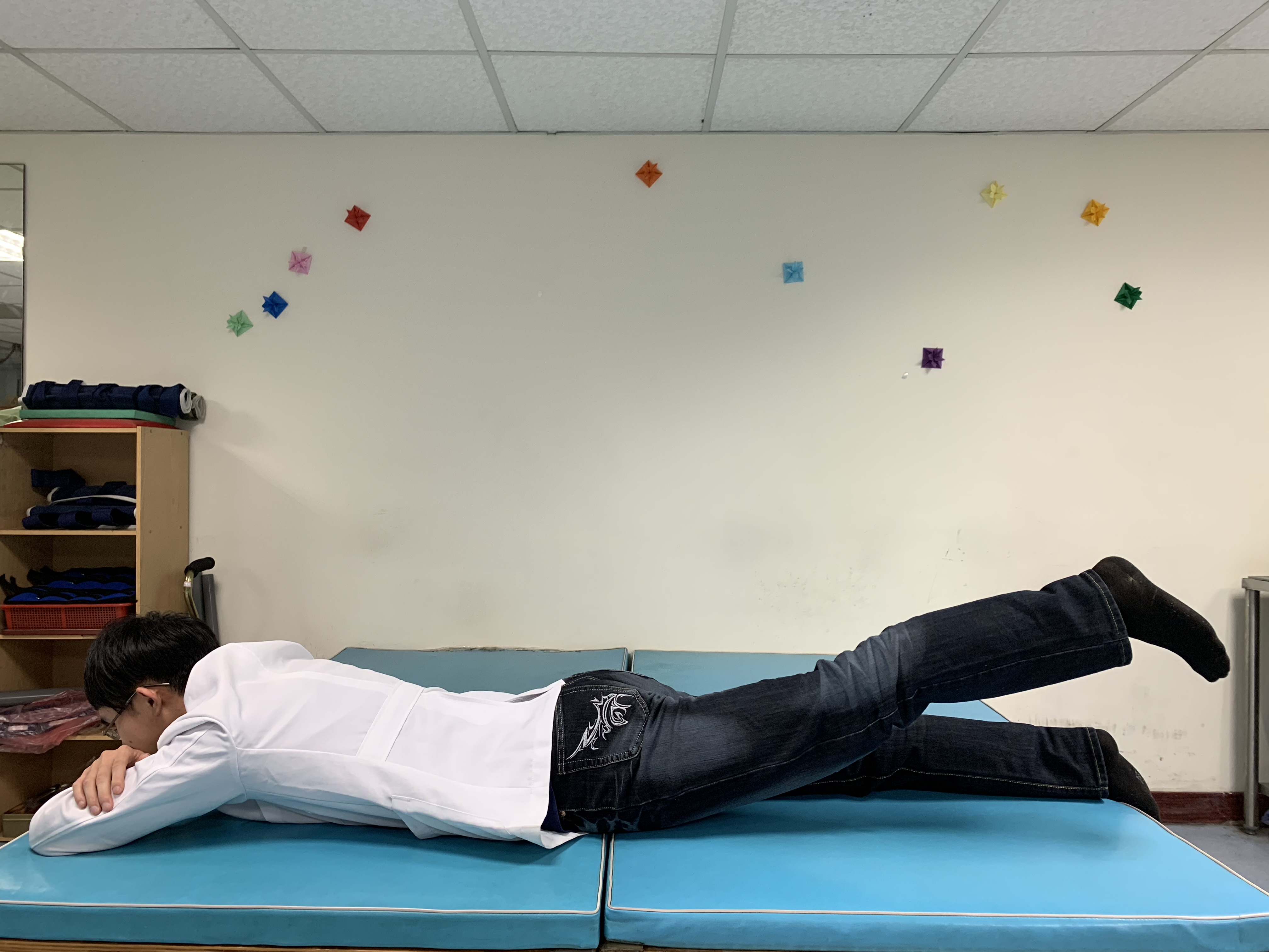 1俯臥姿單腳抬高,越高越好,最好能維持3秒到5秒的時間,再緩緩放下。