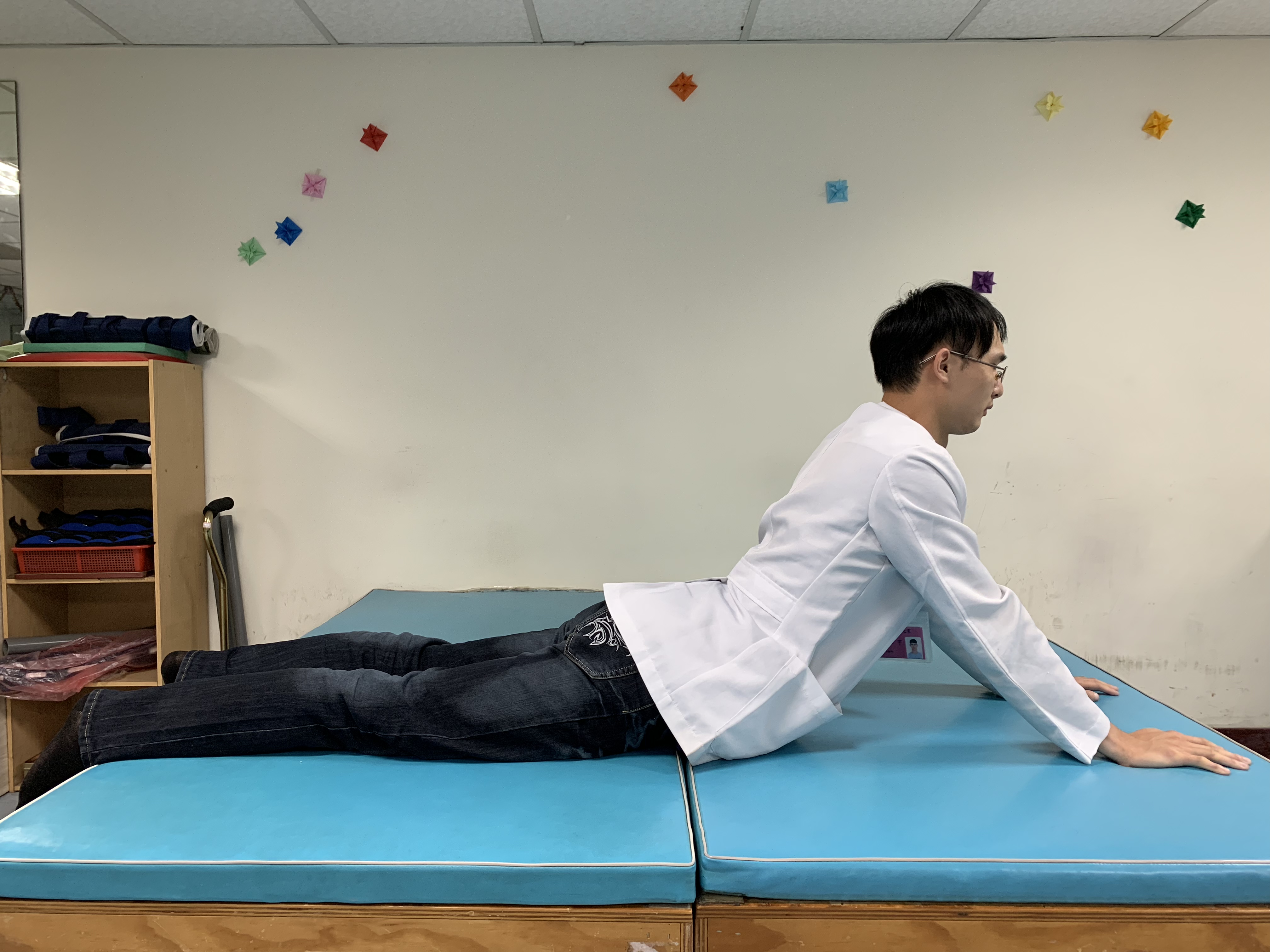 (六)1改良式的「伏地挺身」的做法。上肢打直胸部被動抬起。腹部緊貼床緣。