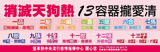 如何杜絕登革熱的傳播?登革熱目前尚無疫苗可提供預防注射,清除登革熱病媒蚊的孳生源是最重要、也是最有效的措施,登革熱病媒蚊的孳生源有哪些呢?凡陰暗潮濕處皆有可能,如廢棄輪胎、廢棄的盆具、盆栽的底盤、地下室儲水槽、冰箱的底盤、寵物的飲水槽、庭園造景的容器等。所以儲水容器不用時應倒置或清除,使用中的儲水容器能加蓋的就加蓋,不能加蓋的可飼養食蚊魚,並置放水生植物;種植水生植物的容器應定期清洗、換水;廢棄容器避免隨意丟棄或堆積,應交由環保單位處理;定期檢查環境易積水處,並定期清除積水。除清除病媒蚊的孳生源外,也可以在住家加裝紗窗、紗門,外出到郊外應穿著長衣、長褲或塗抹防蚊液於暴露之皮膚,以減少蚊蟲叮咬。