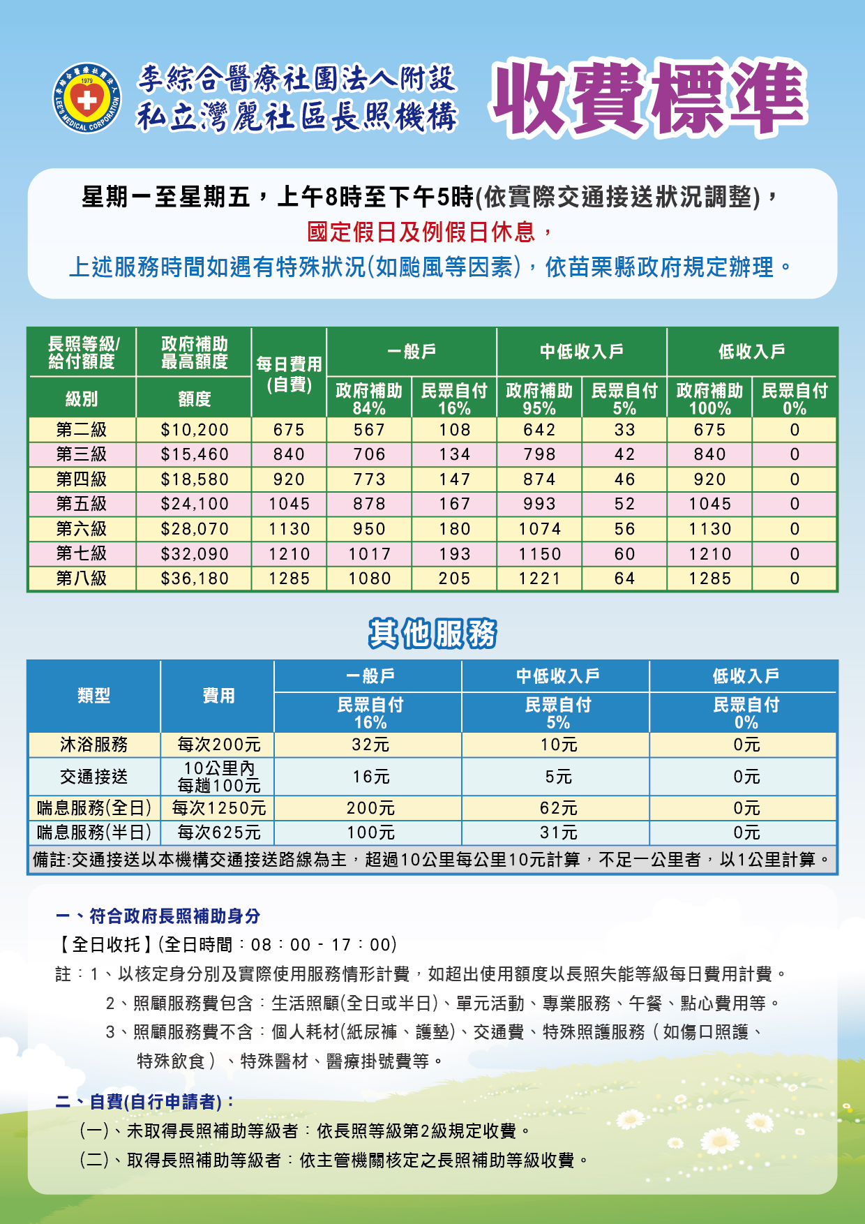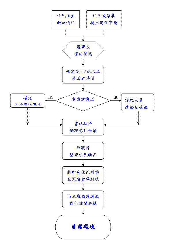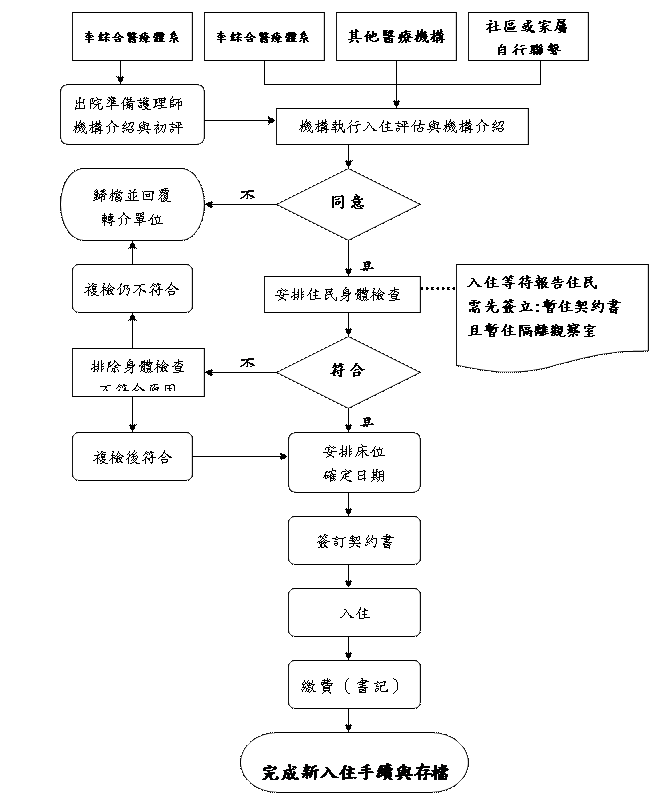 | 申請→入住前協談→評估→安排入住者身體評估、體檢(自費)→符合→簽約→入住護理之家。 | ||||||||